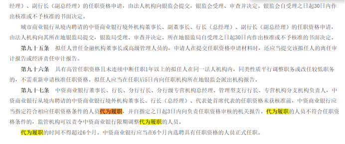 根据原银监会颁布、现仍然有效的行政法规《中资商业银行行政许可事项实施办法》的相关规定,“中资商业银行董事长、行长……代为履职的时间不得超过6个月。中资商业银行应当在6个月内选聘具有任职资格的人员正式任职。”