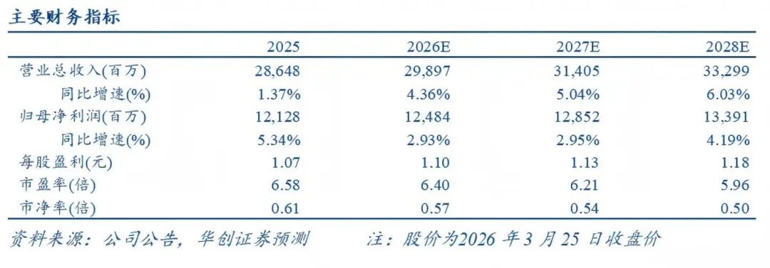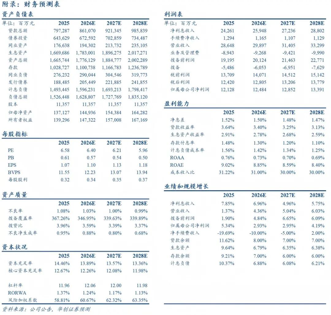 净利息收入继续提速,支撑营收增长;成本节约下,归母净利润增速超5%。 1)规模扩张与息差企稳回升支撑利息收入提速。4Q25营收同比增长3.61%,增速环比上升2.5pct,主要由净利息收入驱动,在规模扩张和单季息差回升背景下,4Q25单季净利息收入同比增长10.65%,增速环比+2pct。2)非息收入形成拖累。代理业务和银行卡业务需求走弱,单季中收同比下降30.8%;而受市场利率波动以及去年同期高基数的影响,单季其他非息收入同比下降43.8%,对营收有所拖累。3)资产质量稳中向好,成本节约提升利润增速。4Q25不良率环比下降4bp至1.08%,拨备覆盖率环比上升2pct至367%。第四季度拨备计提力度有所减小,4Q25资产减值损失同比下降1.36%,成本收入比同比下降0.6pct至31.2%,推动全年归母净利润增速提升至5.35%。