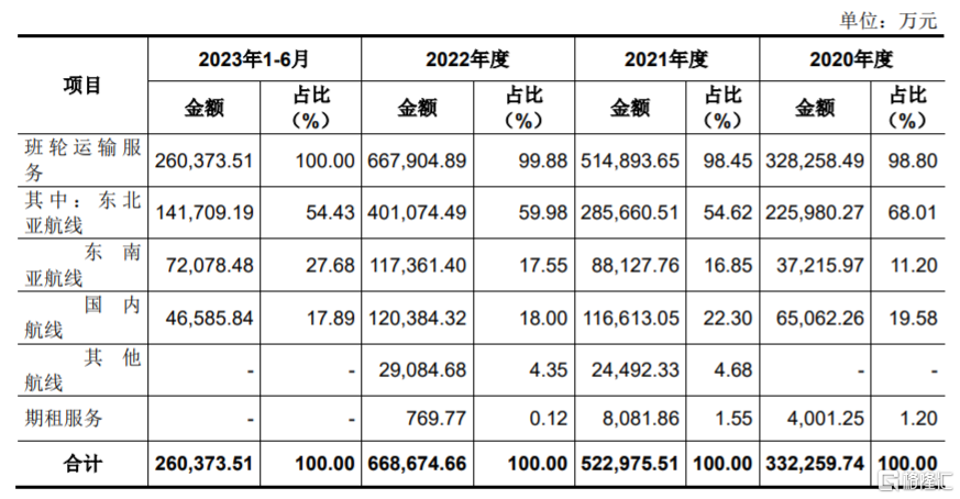 按照服务模式和运输航线区域的不同分类,图片来源:招股书