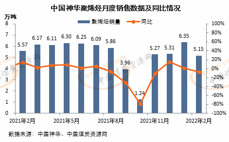 2月份,中国神华合计销售5.15万吨聚烯烃产品,同比减少0.42万吨,下降7.54%,环比减少1.2万吨,下降18.9%。