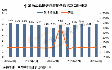 3月份,中国神华合计销售6.06万吨聚烯烃产品,同比减少0.19万吨,下降3%,环比增加0.5万吨,增长9%。