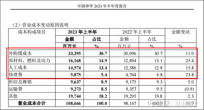 对成本影响最大主要是4项,分别是外购煤成本,原材料、燃料及动力,人工成本,修理费。这4项的同比变动幅度超过10%。