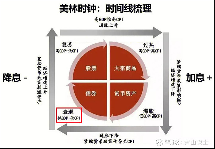 按照“美林投资时钟理论”,当前属于“经济下行,通胀下行”的衰退阶段,在衰退阶段,通胀压力下降,货币政策趋松,债券表现最突出,高股息低波动股票(如中国神华)远远跑赢大盘。