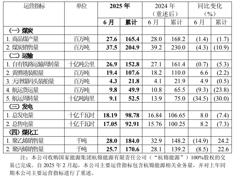 2025年6月,中国神华航运货运量及周转量同比下降的主要原因,是业务结构调整、航线结构变化;聚乙烯、聚丙烯销售量同比下降的主要原因,是煤制烯烃生产设备按计划检修导致聚烯烃产品产量下降。