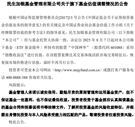 根据中国证券监督管理委员会[2017]13号公告《中国证监会关于证券投资基金估值业务的指导意见》的有关规定及中国证券业协会基金估值工作小组《关于停牌股票估值的参考方法》的指导意见,民生加银基金管理有限公司(以下简称“本公司”)经与基金托管人协商一致,决定自2025年8月7日起对本公司旗下基金(ETF基金除外)所持有的股票“中国神华”(股票代码601088)采用“指数收益法”进行估值。在该股票复牌且其交易体现活跃市场交易特征后,恢复按市场价格进行估值,届时不再另行公告。