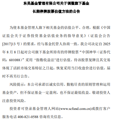 为使本基金管理人旗下相关基金的估值公平、合理,根据《中国证监会关于证券投资基金估值业务的指导意见》(证监会公告[2017]13号)的要求,经与基金托管人协商一致,我公司决定自2025年8月8日起对公司旗下基金所持有的停牌股票“中国神华(证券代码:601088)”采用“指数收益法”进行估值。待该股票复牌且其交易体现了活跃市场交易特征之日起,恢复采用当日收盘价进行估值,届时不再另行公告。