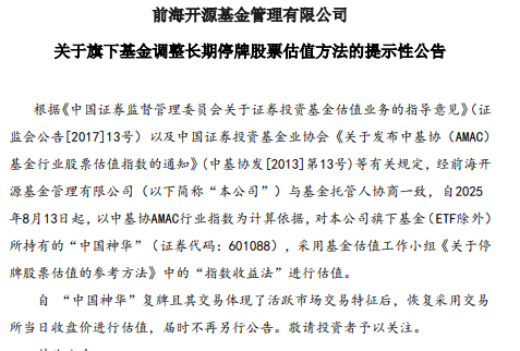 根据《中国证券监督管理委员会关于证券投资基金估值业务的指导意见》(证监会公告[2017]13号)以及中国证券投资基金业协会《关于发布中基协(AMAC)基金行业股票估值指数的通知》(中基协发[2013]第13号)等有关规定,经前海开源基金管理有限公司(以下简称“本公司”)与基金托管人协商一致,自2025年8月13日起,以中基协AMAC行业指数为计算依据,对本公司旗下基金(ETF除外)所持有的“中国神华”(证券代码:601088),采用基金估值工作小组《关于停牌股票估值的参考方法》中的“指数收益法”进行估值。