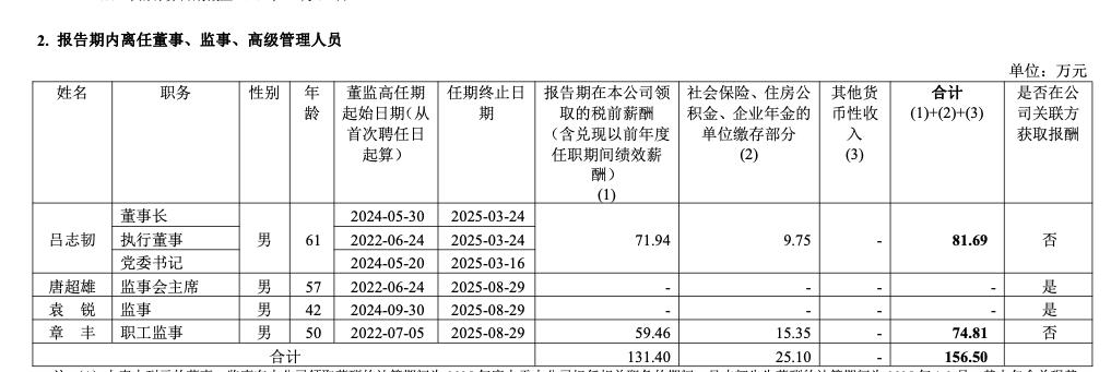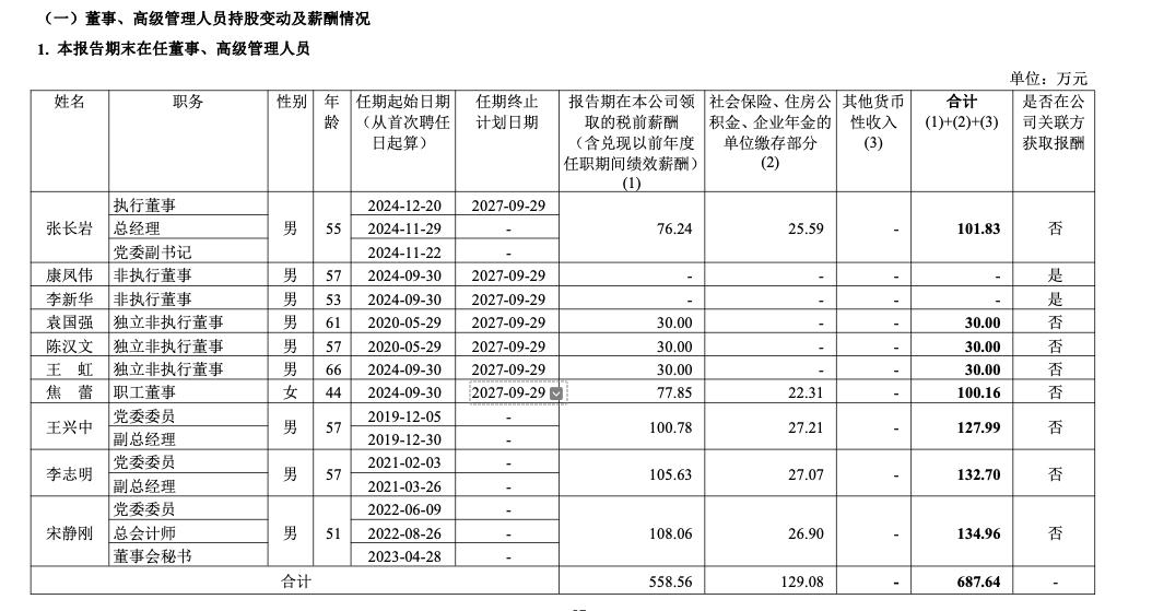 2025年年报显示,公司现任董事、监事和高级管理人员2025年报酬总额687.64万元。离任董事、监事和高级管理人员2025年报酬总额156.50万元,总计844.14万元,比2024年的912.44万元减少68.3万元,同比下降7.49%。执行董事、总经理、党委副书记张长岩2025年从公司获得的税前报酬总额为101.83万元,党委委员、副总经理王兴中2025年从公司获得的税前报酬总额为127.99万元,党委委员、总会计师、董事会秘书宋静刚2025年从公司获得的税前报酬总额为134.96万元,以上人员均未在公司关联方获取报酬。