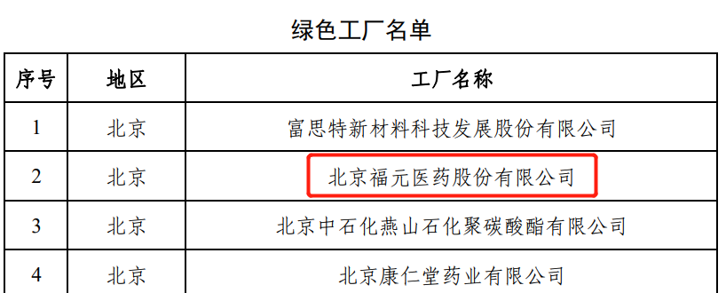 近日,国家工业和信息化部发布2022年度绿色工厂公示名单,北京福元医药股份有限公司荣获国家级“绿色工厂”称号,标志着公司在绿色制造方面又迈出了坚实的一步。