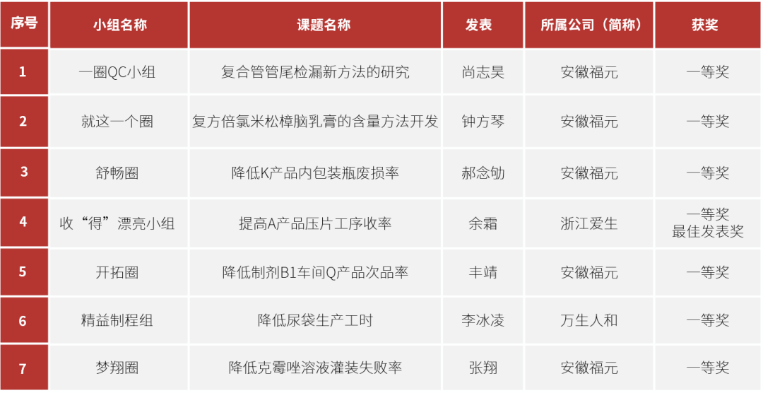 福元医药凭借扎实的质量管理基础和持续的创新改进,最终所有参评课题全部获奖:7个QC小组成果荣获一等奖,其中1个课题更是荣获了“最佳发表奖”。
