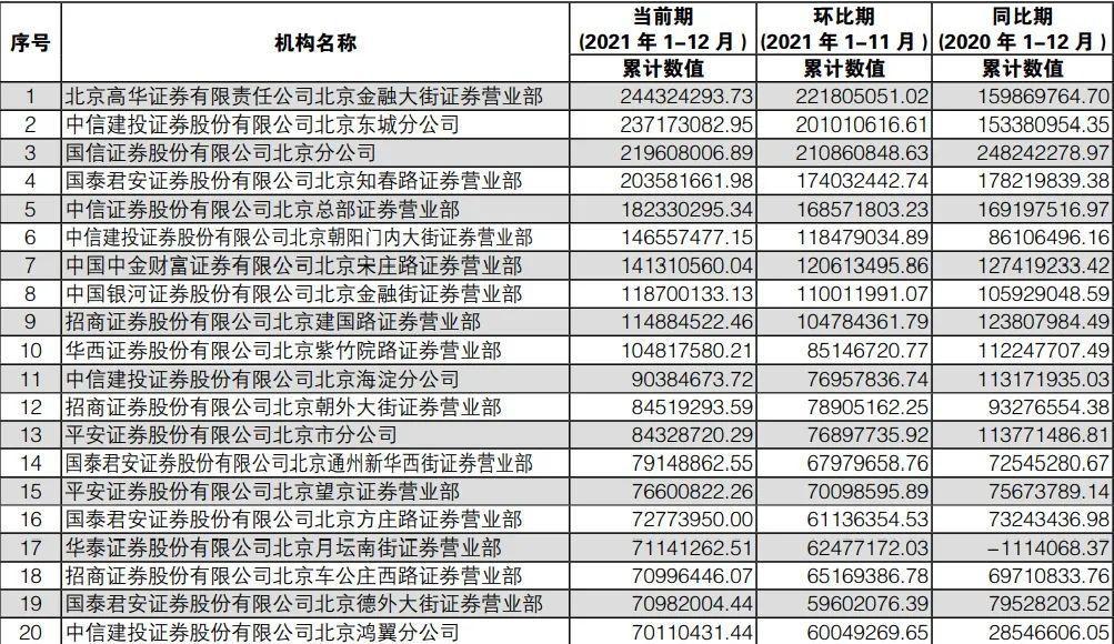 表1 北京地区的券商分支机构2021年营收前20强(单位:元)