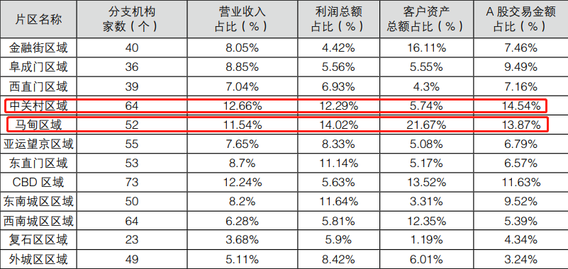 分地域来看,虽然CBD区域的券商分支机构数量最多,但马甸区域的客户资产、利润占比最高,而中关村区域的券商机构营收占比、A股交易金额最高。背后有何玄机?