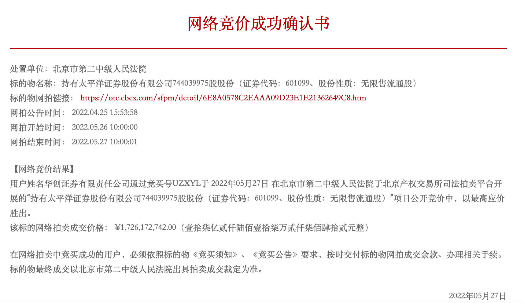 判决生效后,北京嘉裕未在指定期限内向华创证券履行给付义务。2021年12月,华创证券向法院申请依法强制执行。随后,北京嘉裕持有的全部太平洋证券股份在2022年5月26日进行司法拍卖。