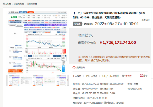 5月27日,太平洋证券7.44亿股股份在北京产权交易所司法拍卖平台进行公开拍卖。尽管关注人数达192人,围观次数超13万次,但报名的仅有一人。