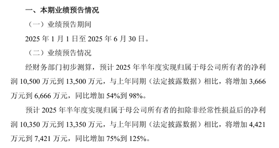 公告显示,经财务部门初步测算,预计2025年半年度实现归属于母公司所有者的净利润10,500万元到13,500万元,与上年同期(法定披露数据)相比,将增加3,666万元到6,666万元,同比增加54%到98%。