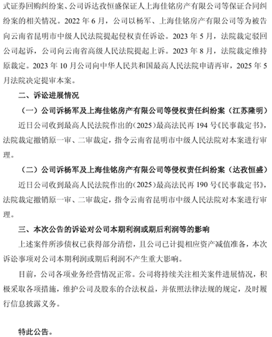 经过漫长的等待,近日太平洋证券收到最高人民法院做出的(2025)最高法民再194号和(2025)最高法民再190号《民事裁定书》。最高人民法院裁定撤销原一审、二审裁定,并指令昆明中院对这两起案件进行重新审理。