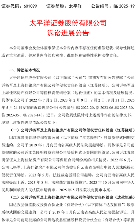 2019 年1月,因江苏隆明投资有限公司(简称:江苏隆明)和达孜县恒盛股权投资合伙企业(有限合伙)(简称:达孜恒盛)在股票质押式回购交易中违约,太平洋证券分别向云南省高级人民法院(简称:云南高院)提起诉讼。