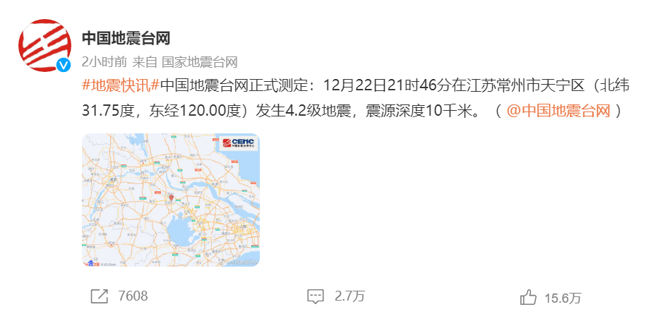 12月22日晚间,经中国地震台网正式测定,21时46分在江苏常州市天宁区(北纬31.75度,东经120.00度)发生4.2级地震,震源深度10千米。
