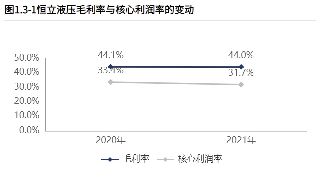恒立液压核心利润率31.75%,核心利润率水平高。与2020年相比,核心利润率下滑1.67个百分点,降幅5.01%,经营活动盈利能力基本稳定。毛利率44.01%,毛利率水平较高。与2020年相比,毛利率下滑0.09个百分点,降幅0.19%,产品竞争力基本稳定。