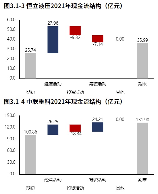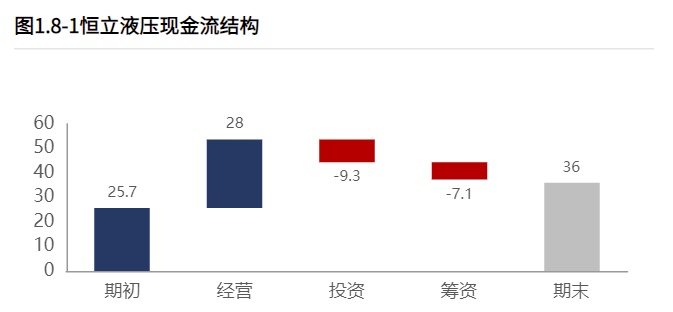 从恒立液压2021年报的现金流结构来看,期初现金25.74亿元,经营活动净流入27.96亿元,投资活动净流出9.32亿元,筹资活动净流出7.14亿元,累计净流入10.25亿元,期末现金35.99亿元。