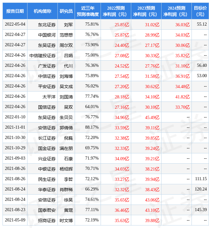 证券之星数据中心根据近三年发布的研报数据计算,安信证券郭倩倩研究员团队对该股研究较为深入,近三年预测准确度均值高达88.17%,其预测2022年度归属净利润为盈利33.59亿,根据现价换算的预测PE为19.62。