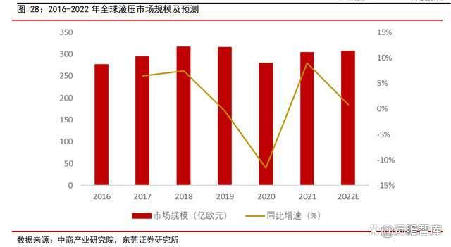 随着液压产品技术与生产工艺的成熟,下游应用领域不断扩大,行业逐步进入相对稳定的发展阶段。2018 年液压行业市场规模触顶后,2020 年受疫情影响,全球经济下行,行业规模有所回落。2021 年市场规模为 304.25 亿欧元,同比增长 9.01%,预计 2022 年市场规模同比小幅度提升至 306.82 亿欧元。