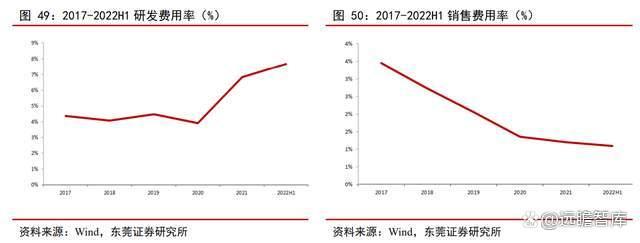 2021 年公司研发费用率为 6.83%,同比提升 2.90pct。2022H1 研发费用率为 7.71%,同比提升 3.06pct。不同于研发费用率,公司销售费用率呈下降趋势,从 2017 年的 3.45%至 2021 年的 1.20%。2022H1 销售费用率为 1.09%,同比提升 0.21pct。