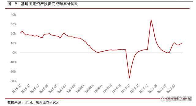 基建固定资产投资自2021年 12 月逐渐回暖,2022年 7 月固定资产投资累计同比 9.58%,同比提升 5.39pct,环比提升 0.33pct。