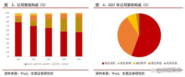 公司液压油缸业务 2017-2021 年营收比例呈下降趋势,但仍保持 50%营收比例,2021 年液压油缸营收比例为 55.72%,同比下降 1.53%。液压泵阀业务营收比例与液压油缸呈相反趋势,2021 年营收比例为 34.76%,同比提升 4.99pct。油缸配件及液压系统 2021 年营收比例分别为 7.27%、2.11%。