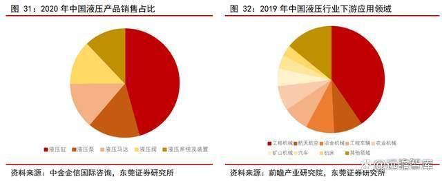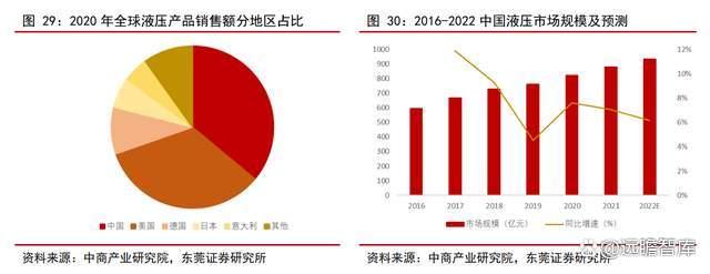 从产品销售市场来看,中国、美国共占据 60%以上全球液压市场,分别销售占比 36.04%、33.62%。虽然我国液压技术起步较晚,但市场规模快速发展,对全球液压产业起到了重要的推动作用。