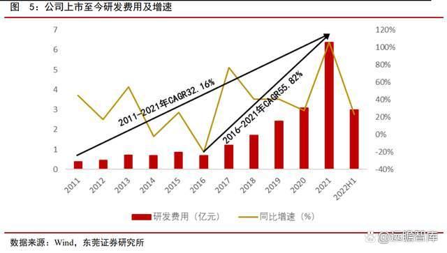 公司2011-2016年研发费用较为波动,2011-2021年复合增长率为 32.16%。2016-2021年研发费用增长速度加快,年复合增长率为 55.82%。2021年研发费用为 6.36 亿元,同比增长105.83%。