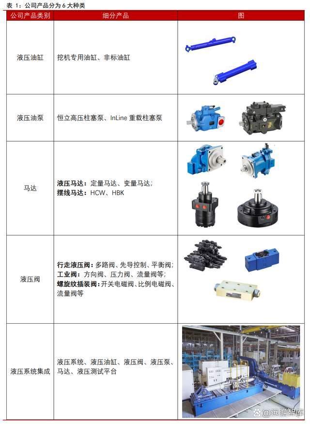 同时,公司并购多家企业,获取关键技术以提高自身研发技术水平。目前,公司产品分为6 大种类,分别为液压油缸、液压油泵、马达、液压阀、液压系统集成、高精密铸件。