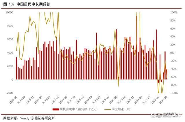 从新增人民币贷款口径来看,居民户中长期贷款连续 8 个月同比少增,在一定程度上表明对房地产需求趋弱。2022 年 7 月,国内居民中长期贷款 1486 亿元,同比少增 2488.00 亿元(同比下降 62.61%),环比少增 2680.72 亿元(环比下降 64.34)。
