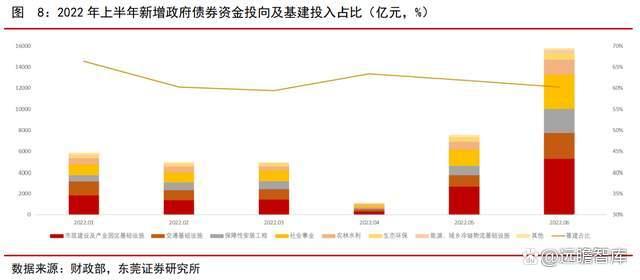 根据我国财政部数据,2021年新增政府债券资金投入基建项目总额 2.49 万亿元,占比 55.71%。2022年上半年新增政府债券资金投入基建项目总额为 24611.60 亿元,占比 61.41%。1-6 月资金投入基建占比分别为 66.39%、60.22%、59.44%、63.41%、61.82%、60.24%,投入占比均超过 50%。