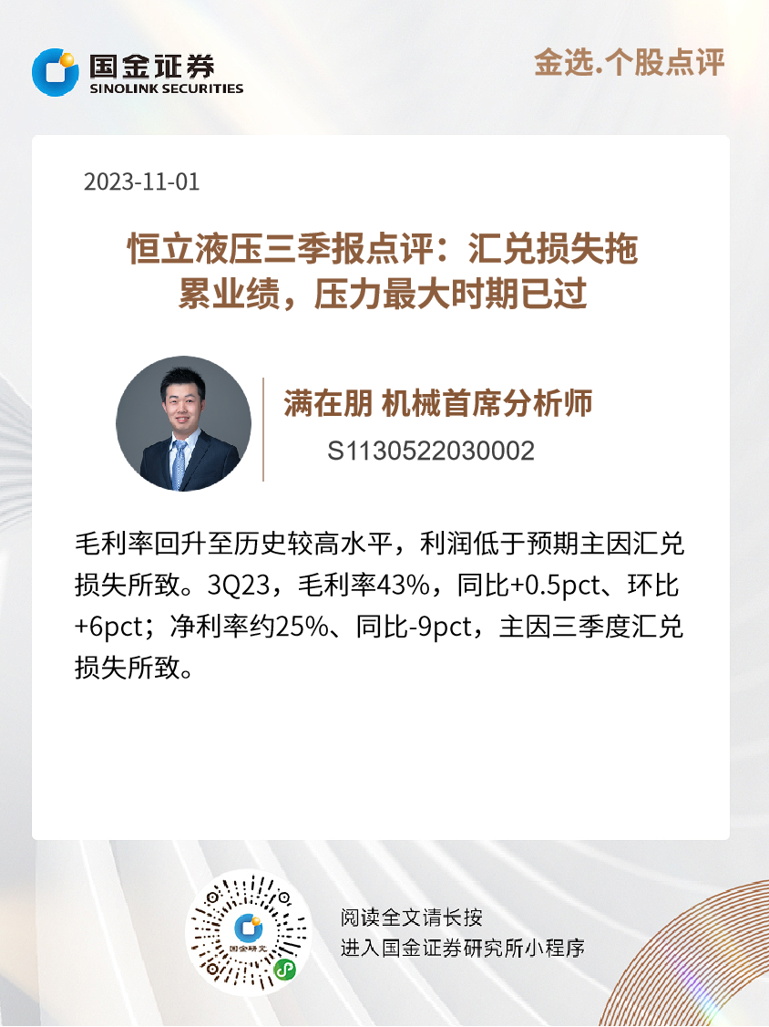 2、毛利率回升至历史较高水平,利润低于预期主因汇兑损失所致。3Q23,毛利率43%,同比+0.5pct、环比+6pct;净利率约25%、同比-9pct,主因三季度汇兑损失所致。