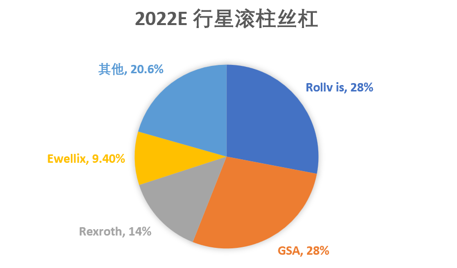 行星滚柱丝杠全球头部企业中,瑞士Rollvis、瑞士GSA、德国Rexroth、瑞典Ewellix合计市场份额已占约80%,国内不具备批量生产能力。