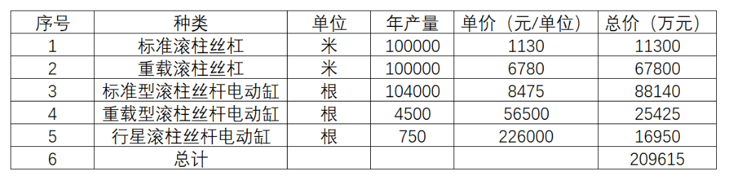 该项目达产后将形成年产10.4 万根标准滚珠丝杠电动缸、4500 根重载滚珠丝杠电动缸、750 根行星滚柱丝杠电动缸、10 万米标准滚珠丝杠和10 万米重载滚珠丝杠的生产能力。