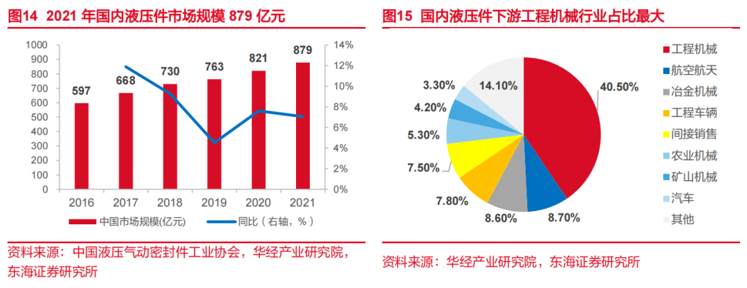 工程机械为液压件下游最大领域,液压件市场需求持续增长。液压核心元件广泛应用于各行业的各类装备,液压件市场的下游行业以工程机械、航空航天、农业机械、机床加工、汽车、船舶、矿山机械等。其中,工程机械行业在液压行业中的应用占比达40.5%,是液压产品最主要的应用行业,其次是航空航天占比达8.7%。我国国内液压件市场逐年上涨,2021年规模达879亿元,未来随着国内高端制造业纷纷兴起对液压件需求持续提升。