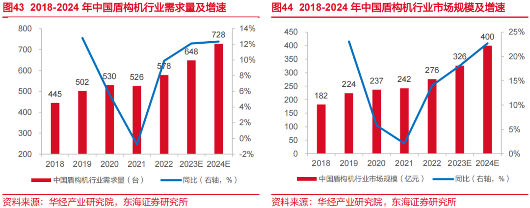 城市化和基建推动盾构机需求,带动盾构机市场空间提升。需求方面,根据华经研究院数据显示,2022年中国盾构机行业需求量达到578台,同比增长9.88%,预计2024年需求超过700台。从盾构机行业市场规模来看,据中国工程机械工业协会数据,2022年中国盾构机市场规模约为276亿元,同比增长14.05%,预计2024年市场空间达到400亿元。根据液压设备占整机成本比在12%,预计盾构机液压件市场空间在48亿元。