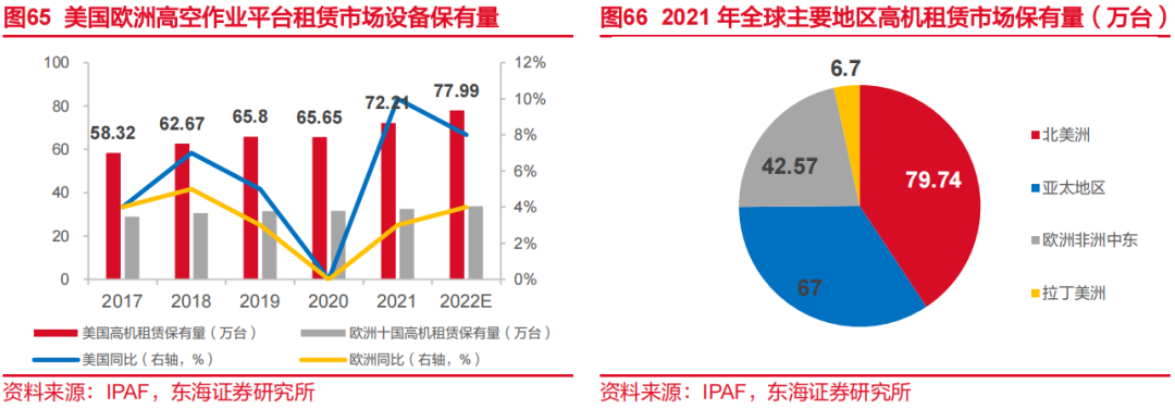 国内保有量较低市场空间广阔。高空作业平台市场发展程度与当地经济水平密切相关,全球市场需求呈现出结构化差异。据IPAF数据,2021年全球高空作业平台租赁市场保有量近200万台。北美、欧洲等成熟市场设备保有量大,增速平稳,需求主要为更新替换需求;中国市场人均保有量低但增速较快,需求主要为新增需求,新兴市场发展潜力较大。