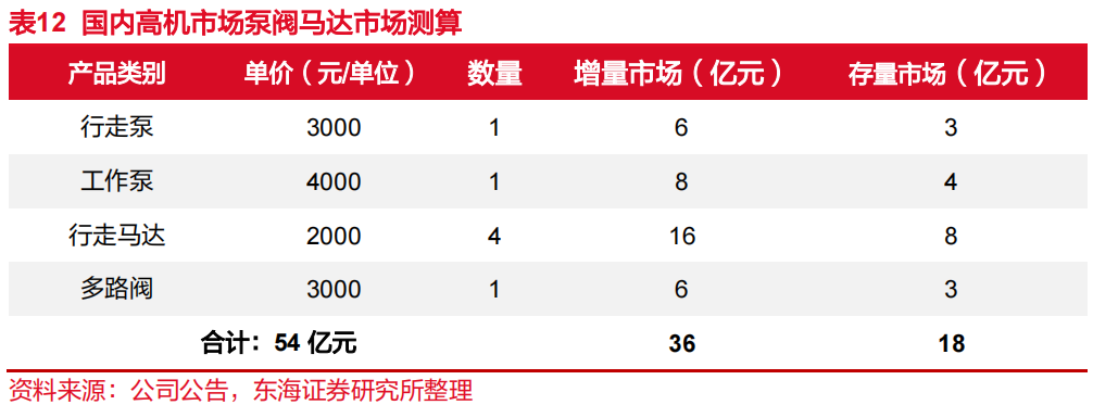 高空作业平台液压件预计在54亿元左右。高空作业平台液压系统中有1个行走泵、1个工作泵、4个行走马达和一个多路阀。根据恒立液压公告数据,泵阀价格推算出单台液压件的价值量在1.8万元。假设未来高空业平台国内销售增量在20万台,液压件的市场空间在36亿元。假设国内存量市场预计在60万台的稳定水平,每六年液压件需要更换一次,预计存量市场的液压件更新维修市场规模在18亿元。国内总计高空作业平台的液压件预计在54亿元左右。