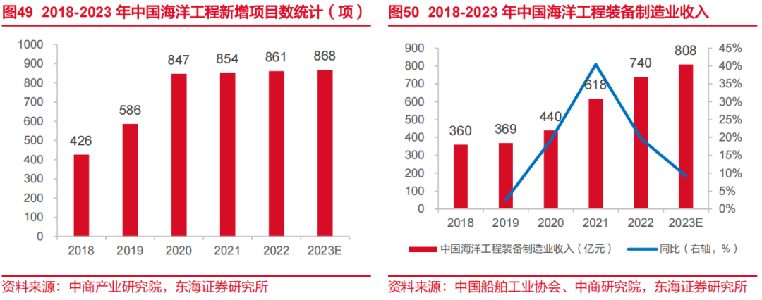 海洋工程项目的需求量与大型化,拉动海洋工程装备企业营收。根据自然资源部数据,2018-2021年中国海洋工程新增项目持续增加,2022年新增海洋工程861项,预计2023年达868项,并且呈大型化趋势。根据中国船舶工业协会统计,2022年中国海工装备制造企业达到740亿元左右。根据中商产业研究院预测,2023年中国海工装备制造公司营业收入将达808亿元。