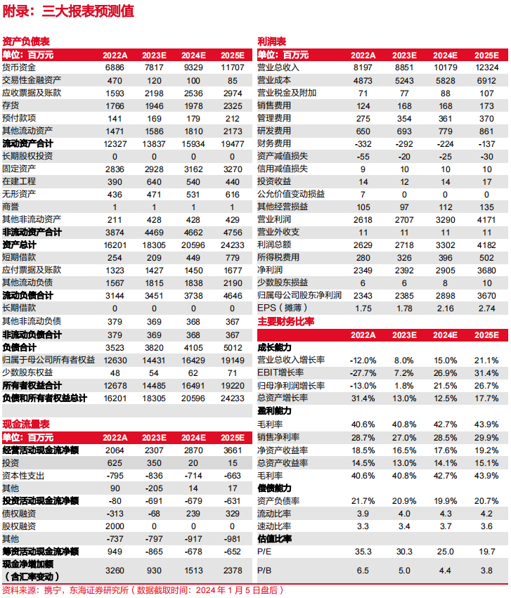 费用方面:考虑到公司近期对研发的持续投入,我们假设2023年研发投入加强,未来两年有一定的回归,但整体绝对值仍保持增长,预计2023/2024/2025年分别为7.83%/7.65%/6.99%;结合2023年前三季度报告情况,公司管理效率提升,预计2023/2024/2025年管理费维持平稳状态,分别为4.00%/3.55%/3.00%;由于公司新品力度推广加大和参展较多,2023年销售费用预计阶段性增长为1.9%,2024/2025年随着营收规模的提升将有一定程度回归,预计对应分别为 1.65%/1.40%。