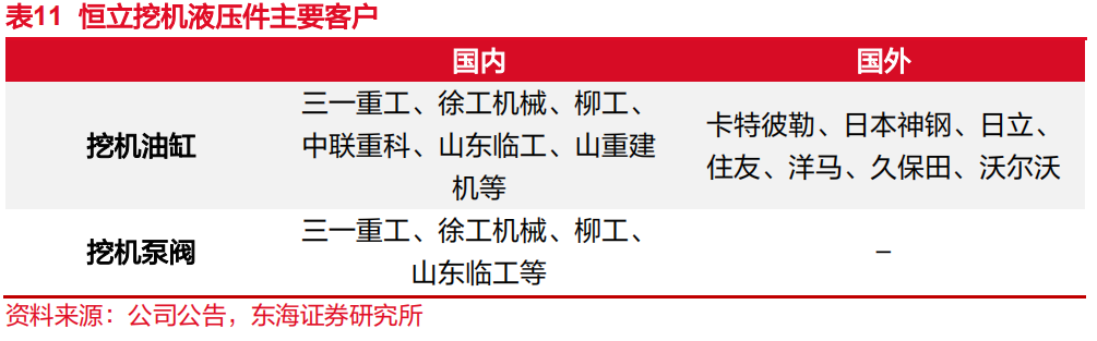赢得国内外主流主机厂深度信赖。自主研发生产的挖掘机用主控泵阀,因各项性能指标均超越第一代产品,以优异的性能,赢得国内主流主机厂诸如三一重工、徐工机械、柳工、山东临工等的信赖,全面大批量配套在了各机型中。在挖机油缸领域公司与国内主机厂基本都与公司建立深厚的合作关系。海外油缸方面目前公司与美国卡特彼勒是合作伙伴,在日本与神钢、日立、住友、洋马和久保田公司建立了稳定合作关系。国内外客户的深度绑定,为公司业绩的确定性打下扎实基础。