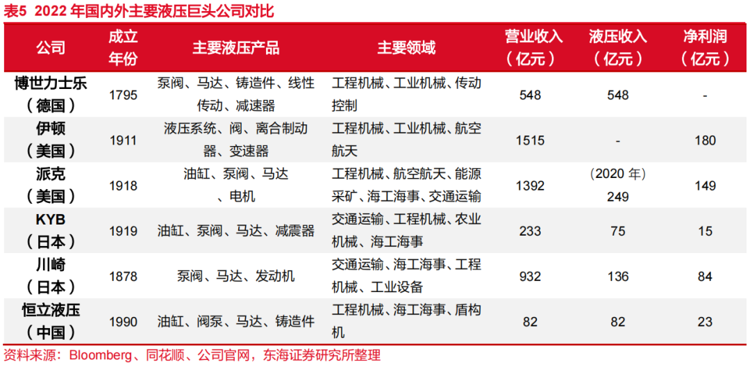 在行走机械领域,国内挖掘机油缸的海外竞争对手为日本KYB;在挖掘机液压泵、阀、马达的海外竞争对手为力士乐和川崎。国产龙头在国产替代进程的同时,也逐步在向海外巨头的市场拓展,空间与机遇更加广阔,力争成为世界级的液压龙头。