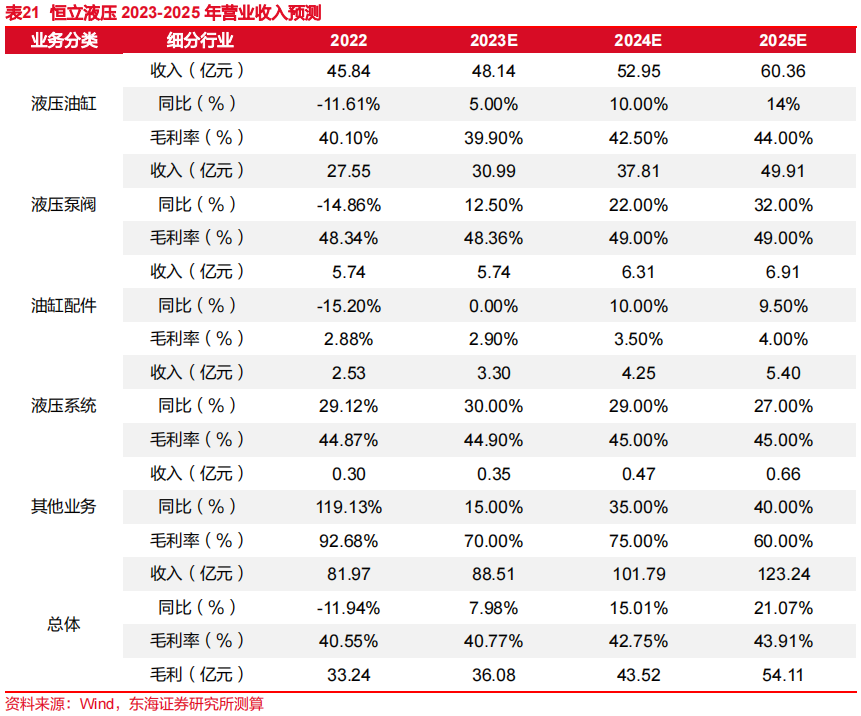 油缸配件:与油缸业务趋势一致总体平稳,2023-2025年收入增速为0%、10%、9.5%,随着原材料的平稳和规模的增长,毛利率分别按 2.9%、3.5%、4.0%计算。