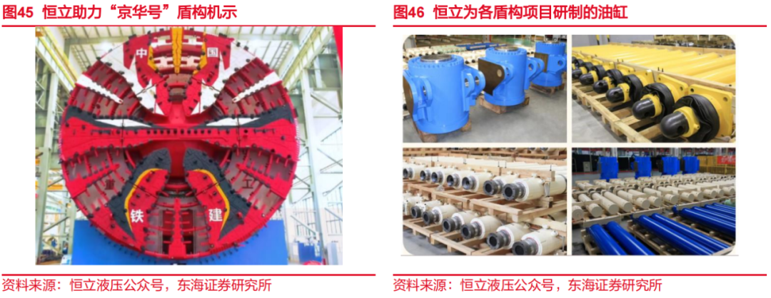 盾构机油缸技术领先,全球市占率超60%。从2005年起恒立开始研发生产盾构机油缸,油缸配套至中交“长城号”等大型盾构机;在美国西雅图Bertha号盾构机中,全套高压油缸均来自公司,即使该在地下施工作业两年,也未出现腐蚀、密封件老化等问题。根据公司公众号,2019年恒立盾构油缸全球市场占有率超过60%,国内市场占有率超过80%,技术世界领先。