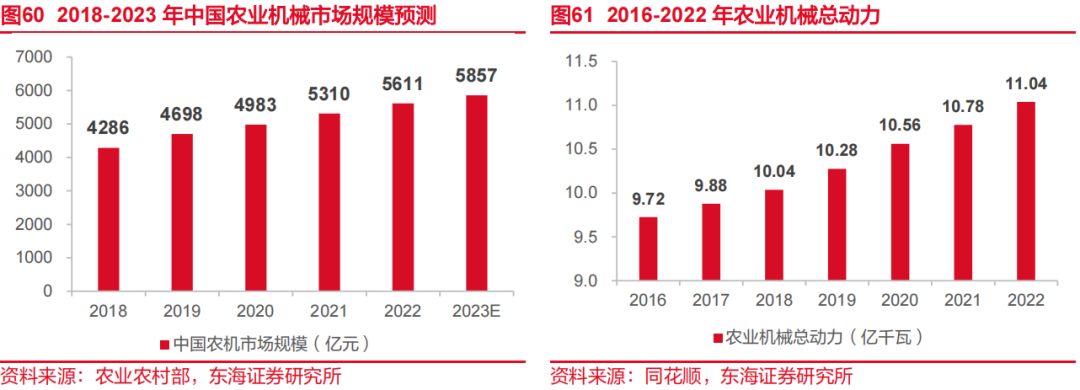 国家建设农业强国的背景下,我国农机需求将快速增长。技术创新、智能化升级、精准农业和特色农业转型近年来,我国农业机械市场规模不断扩大,中国农业机械行业市场规模由2018年的4286亿元增长至2022年的5611亿元,年均复合增长率达7.0%,呈现上升趋势,市场发展前景广阔。根据中商产业研究院预测,2023年我国农业机械市场规模将增长至5857亿元。同时,农业机械总动力是衡量一个国家农业机械化水平的重要指标。近年来,我国农机装备总量持续增长至11.04亿千瓦。