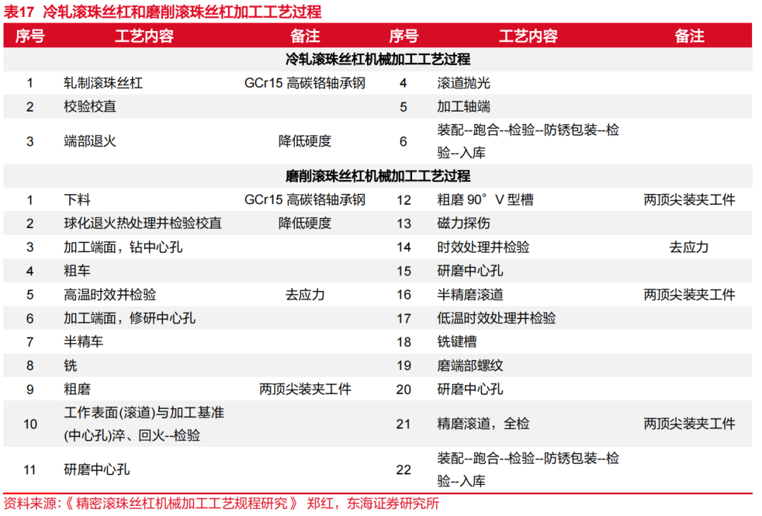 滚珠丝杠从工艺过程上可分为两类:冷轧滚珠丝杠和磨削滚珠丝杠。冷轧滚珠丝杠通过冷加工模具制造,自动化生产效率高、成本低、生产周期几天,但精度略低在P7左右,适用于装备精度要求不高的传动部位。磨削滚珠丝杠产品一致性较高,有统一的标准,经过多道工序包括热处理、车削和磨削等多道工序,精度可高达P1级,生产周期较长在30天以上,适合用于高精度设备的定位部件。