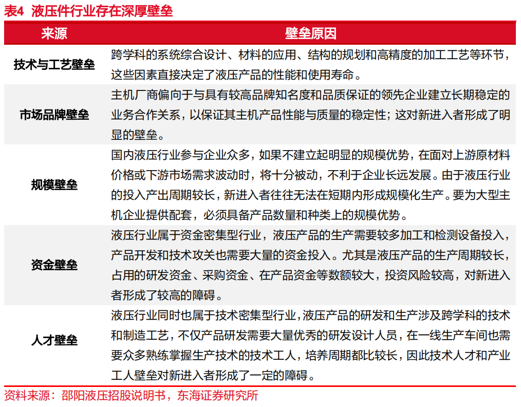 液压件行业壁垒深厚属于资本技术密集型行业,研发及技术复杂、验证周期长、客户粘性大、资金投入期和人才紧缺,新进入企业很难挤入,行业格局向头部企业集中。